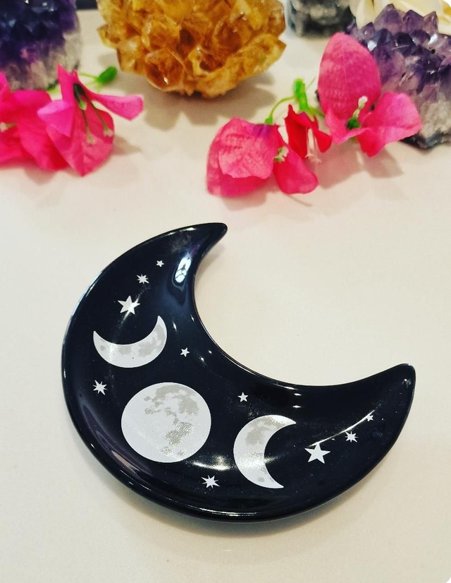 This ceramic trinket dish is shaped like a crescent moon and features a cool triple moon design. Ideal for holding jewellery and other small accessories.